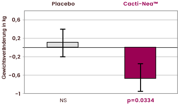 An einer Studie über die Wirksamkeit von Cacti-Nea™ nahmen 49 Frauen mit einem normalen Body-Mass-Index teil. Die Teilnehmerinnen wurden in zwei Gruppen aufgeteilt. Die Frauen der ersten Gruppe erhielten 2 g Cacti-Nea™ pro Tag, während die Frauen der zweiten Gruppe ein Placebo erhielten. Nach 28 Tagen konnte nachgewiesen werden, dass Cacti-Nea™ - im Gegensatz zu dem Placebo - das Wassermasse im Körper deutlich verringert und zur Gewichtsreduktion beiträgt.